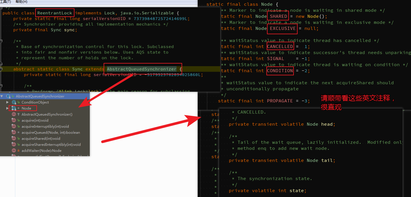 其实所说的就是分布式锁的原理,其实我们是可以从 volatile 的语义联系到锁的语义的,拿 ReentrantLock 来说,其底层也无非是维护一个节点(请看下图),用的也是 volatile 语义,再回头看看 zookeeper 的这种操作方式,难道还有疑虑么,所谓的抽象出来的高度的东西,其实还是底层的一些实现,用的代码也逃不出底层代码那些套路,包括 zookeeper 里的 barrier,计数器等等。