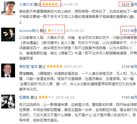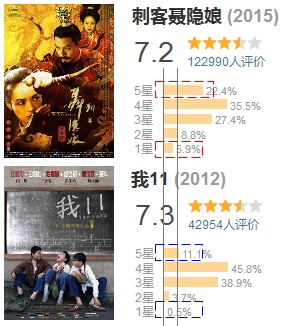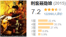 ● 刺客聂隐娘:同时有不少人觉得不错/较差,在 1 星和 5 星有不少的分布。