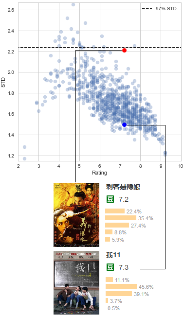 用近几年的国内上映的电影,做出标准差(STD) - 豆瓣评分(Rating )散点分布图。为了便于比较,做标准差 97% 范围线。