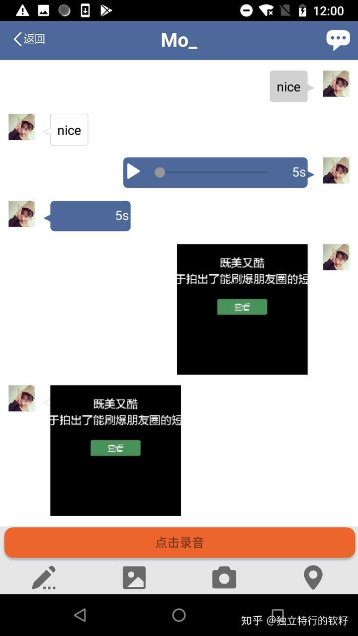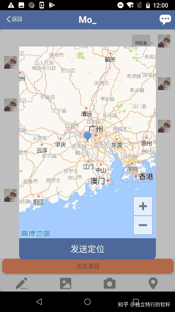 聊天界面支持发送文字,语音,图片,定位,当时觉得微信语音如果有个地方没听到就需要重新听一遍特别烦,就做了带进度条的语音,那时候得到导师表扬还特别得意,直到第一次进知乎 LIVA 我就震惊了,我发四这个创意绝对不是抄的知乎。