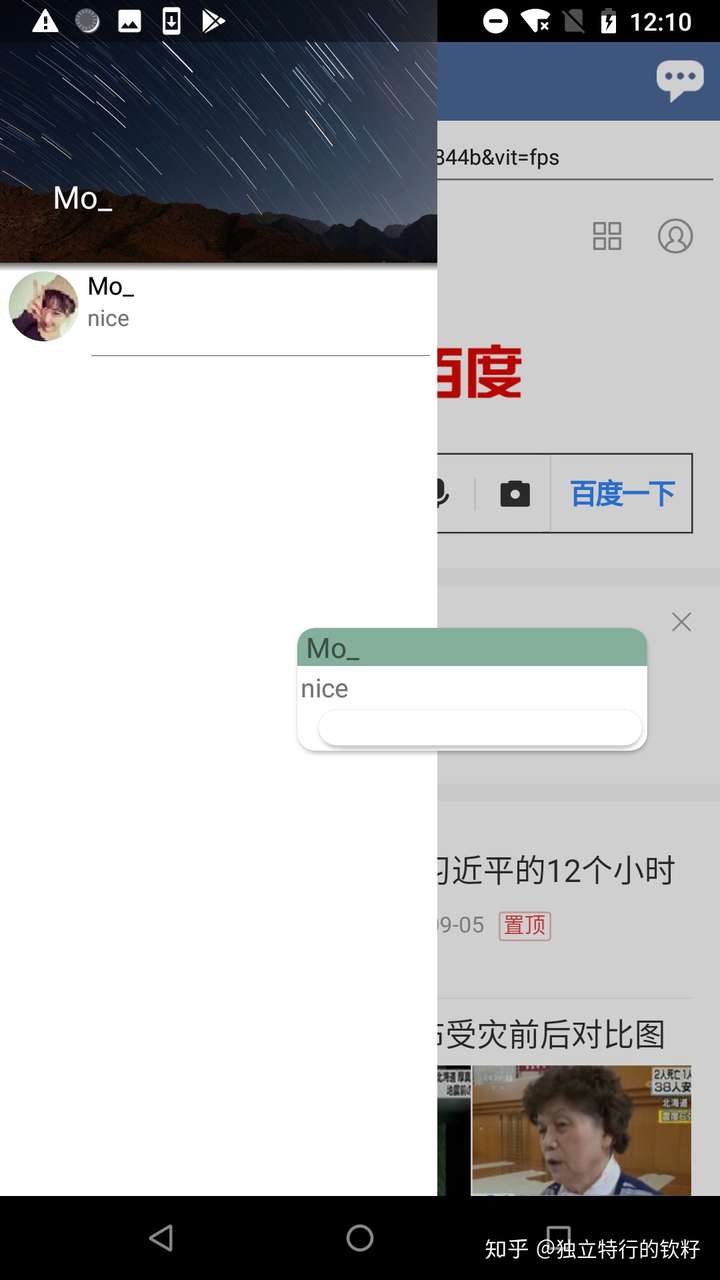 所以当时就在构思,如果我是产品,我会怎么做才能让微信的聊天功能和浏览功能不会被割裂开来(其实是课室没有网络在发呆)于是兴冲冲的回到宿舍就开始撸(代码啊喂)我的 Android 开发专业课在大三下学期才开,在上学期我就把基本的自学完了,课余时间(除去打 LOL 的时间)就在宿舍不断把想法完善,然后大四顺便把这个作为我的毕业设计。于是就有了下面的 DEMO 了