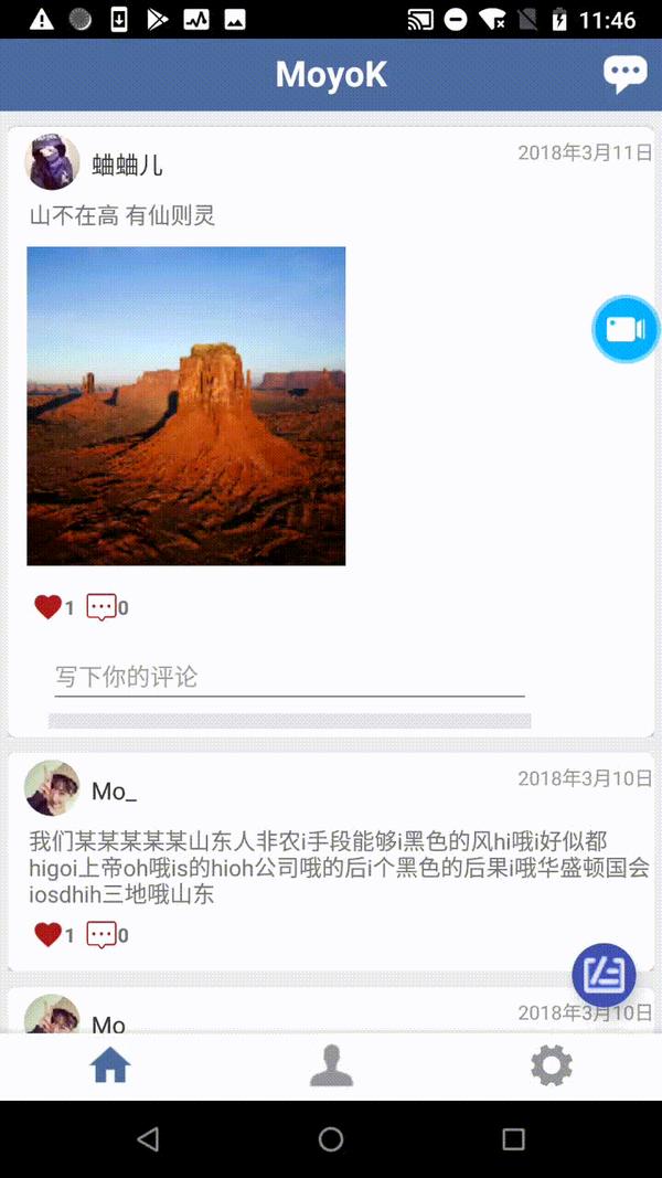 主界面除了基本的登录注册,还有浏览朋友圈,发布朋友圈,点赞,评论,删除,添加好友,接受好友申请,搜索好友,联系人朋友圈,备注删除联系人等