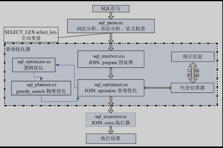 - 语法分析阶段: 将 SQL 查询语句经词法和语法分析后变换成为一棵查询树 st_select_lex 传给优化器,并对 SQL 表达的语义进行检查。