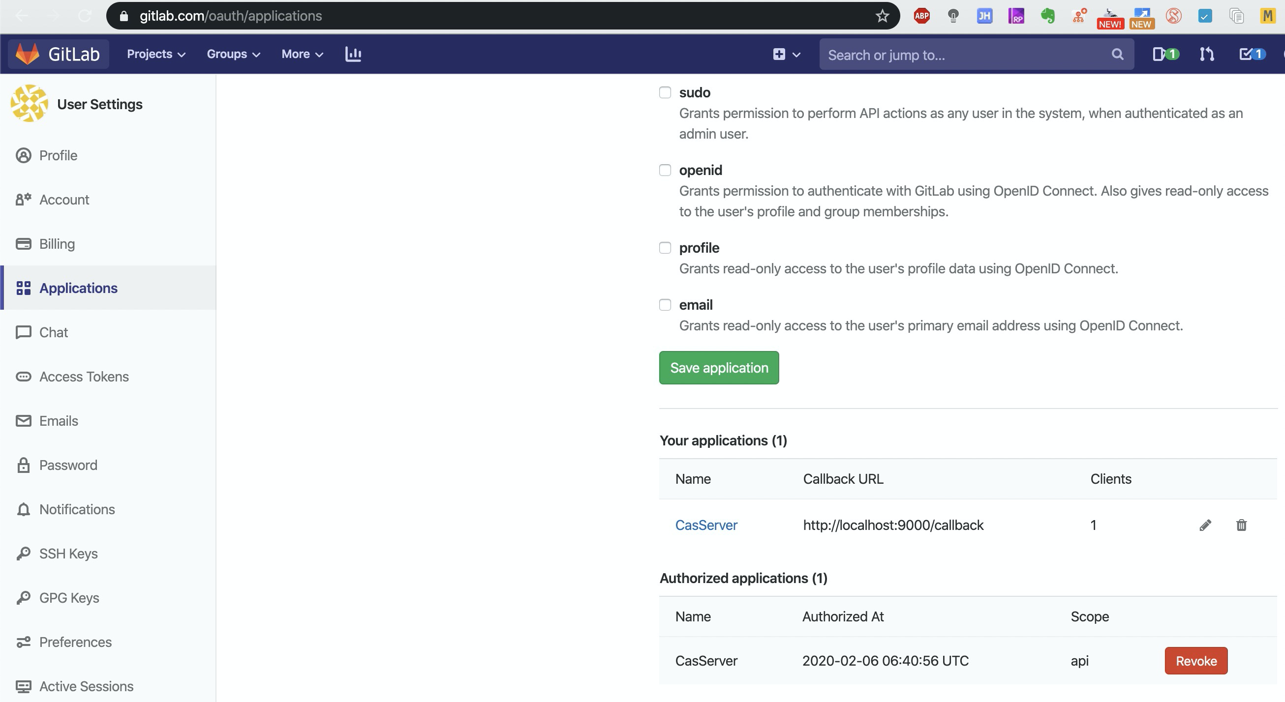 clientId&Secret通过创建Gitlab applications获得- 通过浏览器转换,所以