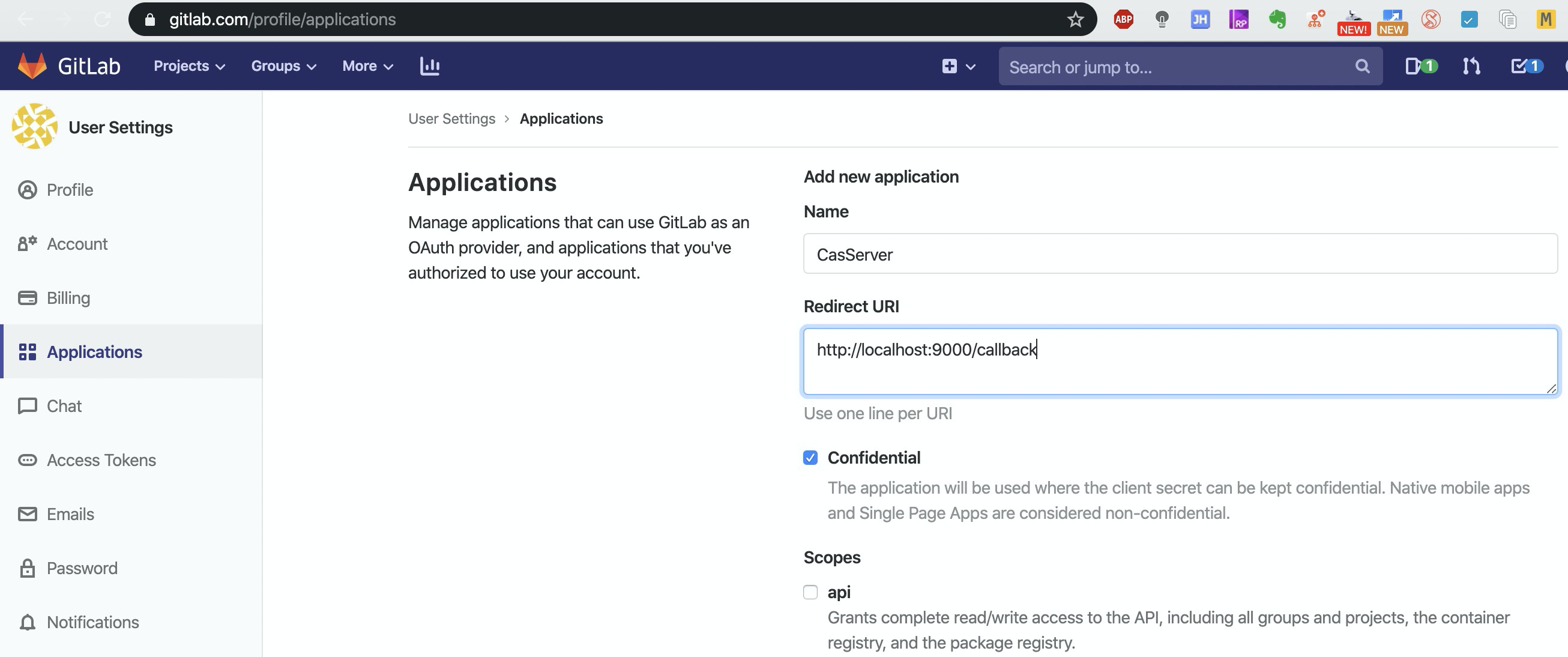 - User Settings -> Applications 中填写名称及 Redirect URI, 只需要勾选 Confidential