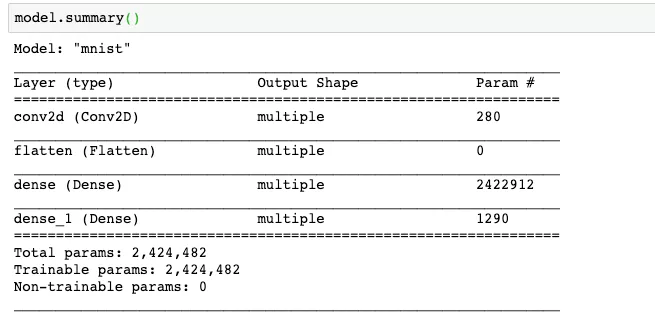 本文利用 summary 接口来查看模型的情况,可以看到我们的每层网络的类型、输出、参数的个数,最下面还是统计了可训练参数,全部参数的情况。