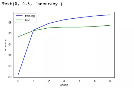 然后我们把训练中的记录下来的训练集和测试集的精确度结果放到图表中,用以查看我们的训练情况:绿色为测试集曲线,蓝色为训练集曲线。