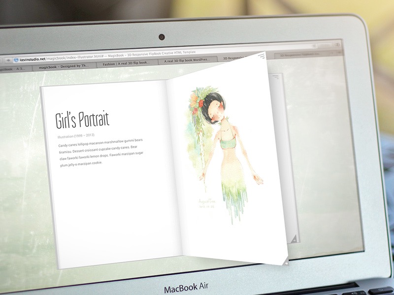 经过两个简单的作品铺垫,几个月的打磨,我后来有一款主打作品通过审核上线了。是一款主打创意特效和极简设计的网站模板,可以在屏幕上模拟一本有 3D 立体翻页效果的书,附带各种自然又有一点酷的动画效果。(当然下图这种能翻出屏幕的效果是为了宣传后期制作的)