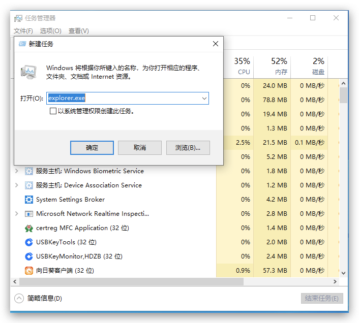 使用快捷键方式 Ctrl+Alt+Del,打开任务管理器,文件-运行新任务,输入 `explorer.exe` 点击确定,等待完成,一会儿就能看见界面了!