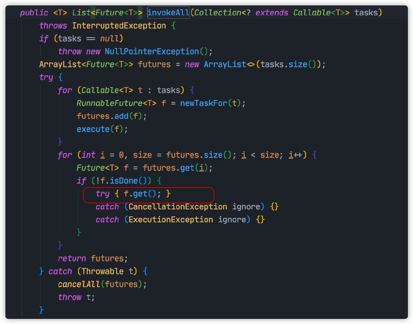 上面代码中,使用 invokeAll 执行所有任务。由于这个方法返回值为 List<Future<T>>,我误以为这个方法如 submit 一样,异步执行,不会阻塞主线程。