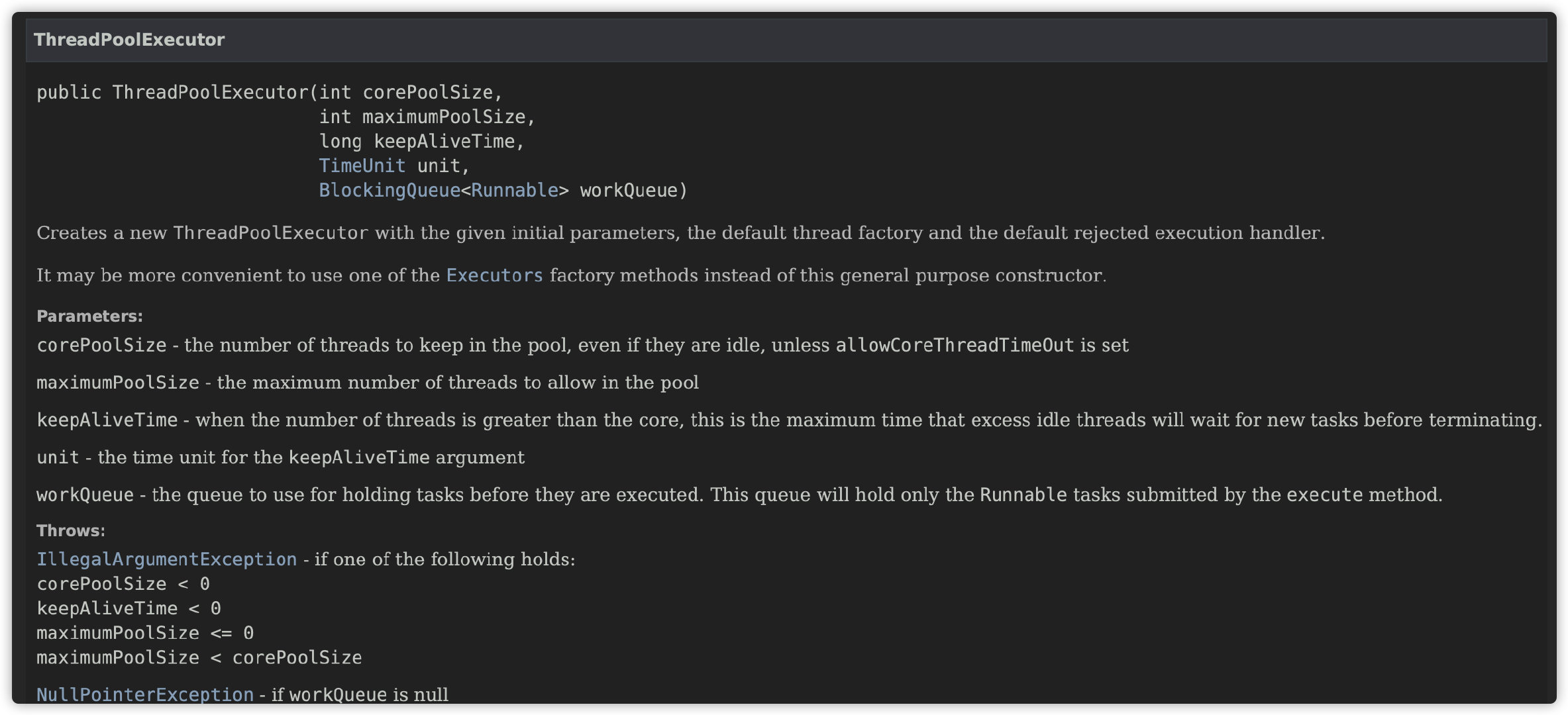 不过线程池的构造函数可以说非常复杂,就算最简单的那个构造函数,也需要传入 5 个参数。这对于新手来说,非常不方便哇。
