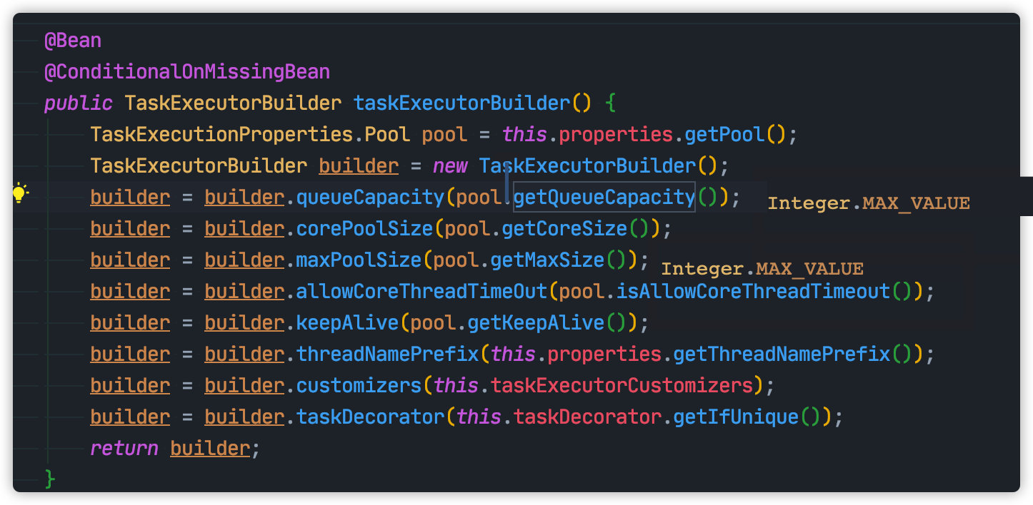 如果是 SpringBoot 项目,从本人测试情况来看,默认将会创建核心线程数为 8,最大线程数为 Integer.MAX_VALUE,队列数也为 Integer.MAX_VALUE 线程池。