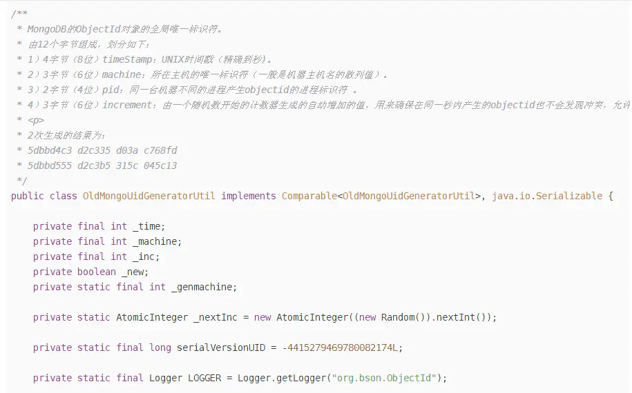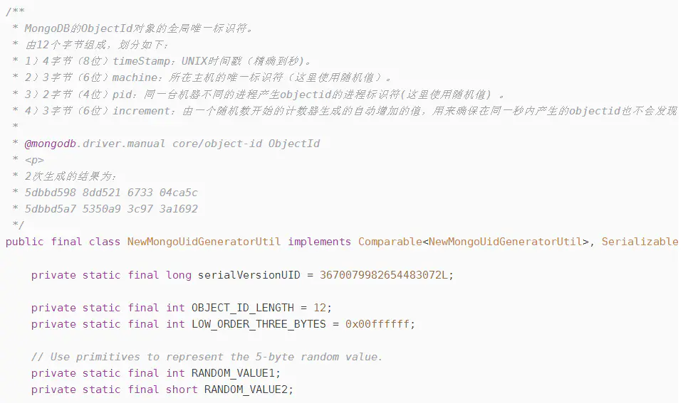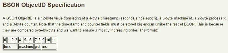 mark:从 MongoDB 3.4 开始(最早发布于 2016 年 12 月),ObjectId 的设计被修改了,中间 5 字节的值由原先的 “机器标识码 + 进程号” 改为用随机数作为机器标识和进程号的值。