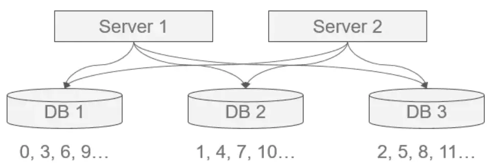 如图所示,可保证每台数据库生成的 ID 是不冲突的,但这种固定步长的方式也会带来扩容的问题,很容易想到当扩容时会出现无 ID 初始值可分的窘境。解决方案有: