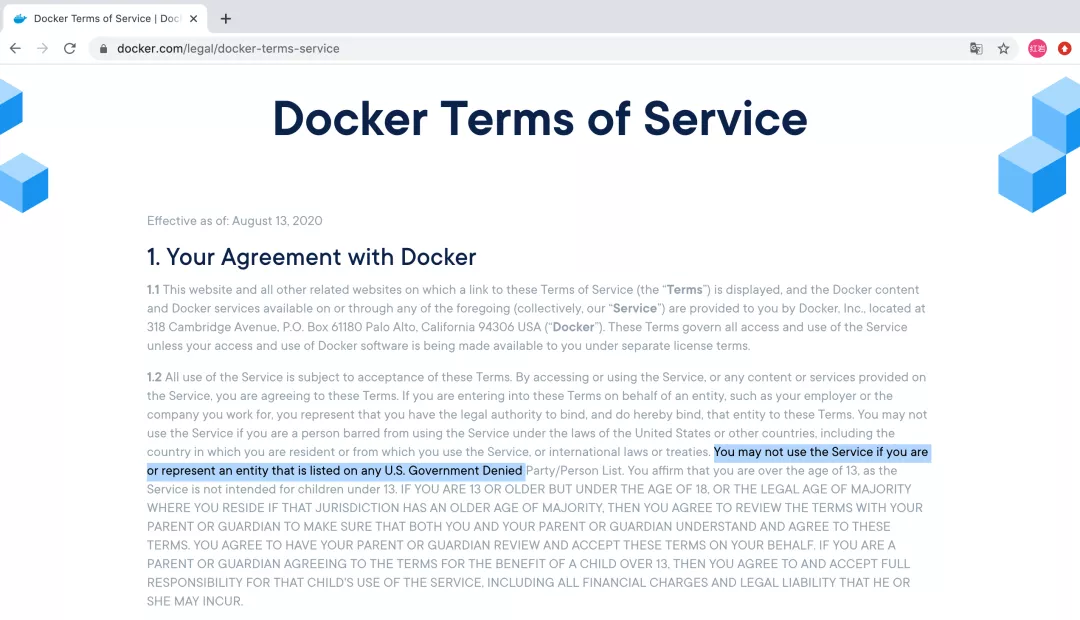 Docker 最新《服务条款》2020 年 8 月 13 日已生效: