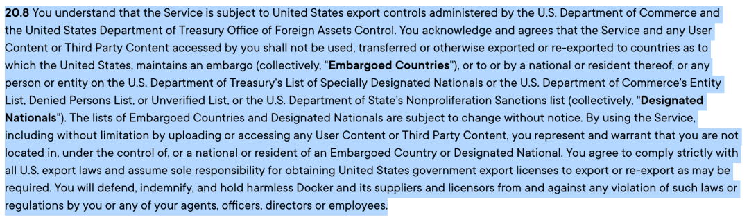 20.8 该服务受美国商务部和美国财政部外国资产控制办公室管理的美国出口管制条例的约束。您承认并同意,该服务以及您访问的任何用户内容或第三方内容不得被使用、转移或者以其他方式出口或再出口到美国实施禁运的国家(统称为“被禁运国家”),或者美国财政部的特别指定国民名单或美国商务部的实体名单、被拒绝人士名单或未经验证的最终用户名单或美国财政部的不扩散制裁名单上的公民或居民,或者任何人或实体(统称为“指定公民”)。被禁运国家和指定公民的名单如有变更,恕不另行通知。如果使用服务,包括但不仅限于通过上传或访问任何用户内容或第三方内容,您表示并保证自己不在被禁运国家,不受被禁运国家的控制,也不是被禁运国家的公民或居民。您同意严格遵守所有美国出口法律,并根据需要,完全承担获得美国政府出口或再出口许可证的责任。您将确保 Docker 及其供应商和许可方免受您或您的任何代理人、管理人员、董事或雇员违反此类法律或法规所造成的影响。
