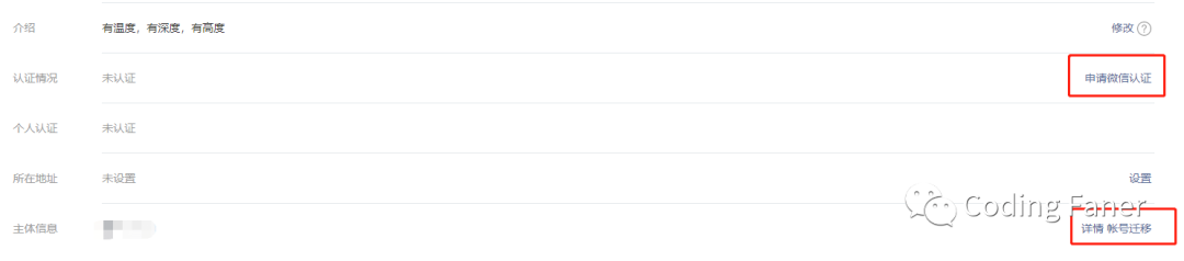 可以点击申请微信认证,个人帐号,暂不支持认证。