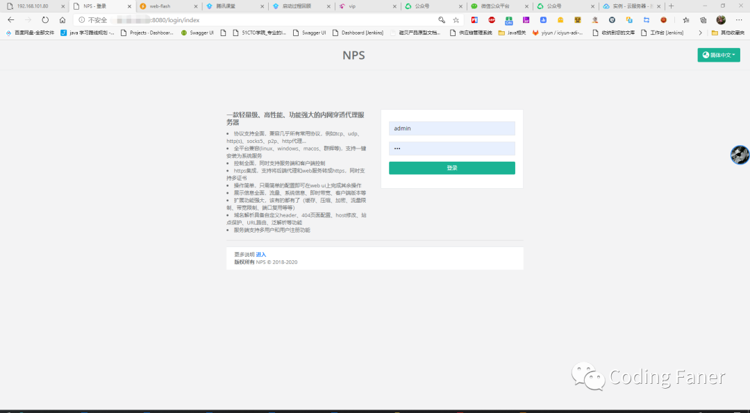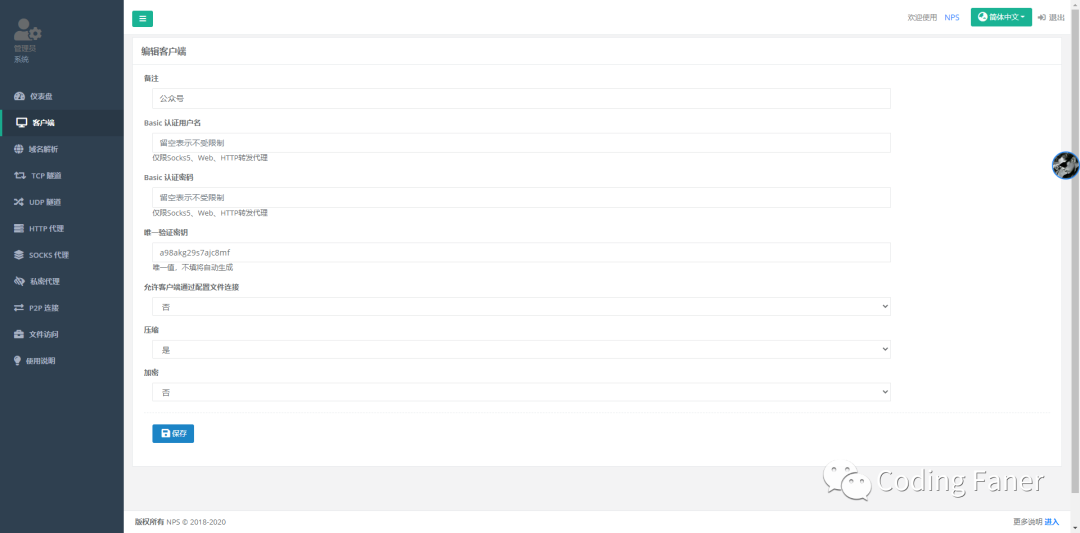 nps** **nps 是一款轻量级、高性能、功能强大的内网穿透代理服务器。目前支持 tcp、udp 流量转发,可支持任何 tcp、udp 上层协议(访问内网网站、本地支付接口调试、ssh 访问、远程桌面,内网 dns 解析等等……),此外还支持内网 http 代理、内网 socks5 代理、p2p 等,并带有功能强大的 web 管理端。