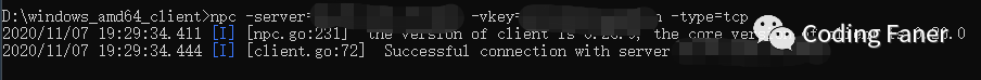 在客户端列表,点击新增客户端左侧的 + 号,将客户端指令复制出来,在本地客户端执行如下命令,会看到连接成功的日志