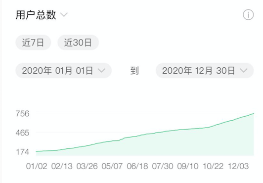2020 年是我运营微信公众号【我的 Android 开源之旅】的第二年,由于我微信公众号的运营比较佛系,因此关注的用户量增长并不是很快。以下是我这一年微信公众号用户总数的增长趋势图: