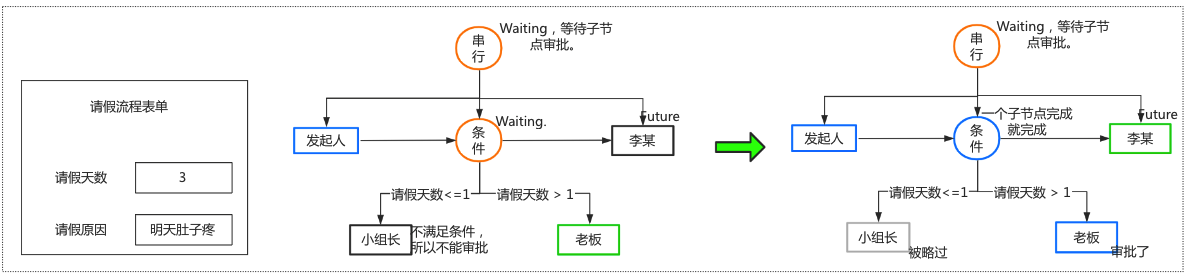 - Waiting: 只有复杂节点有该状态,表示在等待子节点审批。