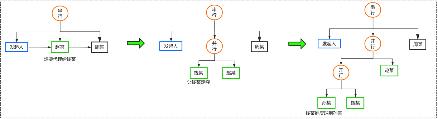 - 代理操作的本质是,新建一个并行节点作为本节点的父节点,再新建一个兄弟节点放代理人,这样自己和代理人都能审批通过。