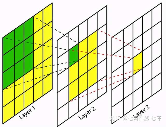 卷积神经网络中,越深层的神经元看到的输入区域越大,如下图所示,kernel size 均为 3×3,stride 均为 1,绿色标记的是 Layer2 每个神经元看到的区域,黄色标记的是 Layer3 看到的区域,具体地,Layer2 每个神经元可看到 Layer1 上 3×3 大小的区域,Layer3 每个神经元看到 Layer2 上 3×3 大小的区域,该区域可以又看到 Layer1 上 5×5 大小的区域。