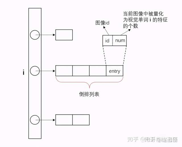 基于得到的视觉词库,计算所有图像(或视频中帧)数据的 BoVW 向量。检索进程启动时,将目标数据库中所有图像的 BoVW 向量构建索引。输入一副检索图像,提取该图像的 BoVW 特征,然后与目标库向量进行距离比对,查找近邻向量。 最直观的查找方法是蛮力查找即将查询向量 q 与所有的 BoVW 向量进行距离计算。这种穷举方式对大数据集或高维向量的查找效率非常低。为改进这个问题,Video-Google[1]提出采用倒排文件 IVF 结构进行索引构建,IVF 索引结构如下图所示。图中 i 表示每个视觉单词。