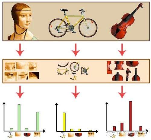 通过观察会发现,同一类目标的不同实例之间虽然存在差异,但我们仍然可以找到它们之间的一些共同的地方,比如说人脸,虽然说不同人的脸差别比较大,但眼睛,嘴,鼻子等一些比较细小的部位,却观察不到太大差别,我们可以把这些不同实例之间共同的部位提取出来,作为识别这一类目标的视觉词汇。