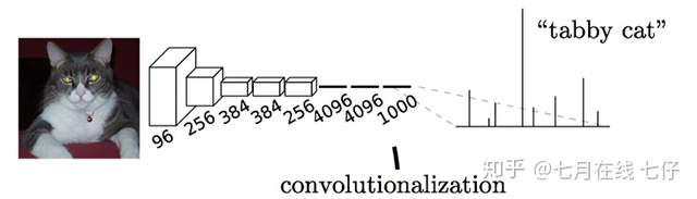 比如:下图中的猫, 输入 AlexNet, 得到一个长为 1000 的输出向量, 表示输入图像属于每一类的概率, 其中在“tabby cat”这一类统计概率最高。
