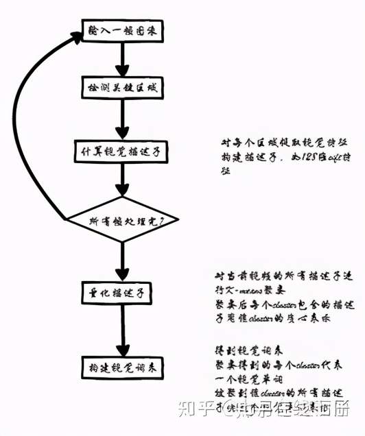 对图像提取若干个局部特征描述子,如 SIFT,对这些描述子进行量化。量化器通常通过聚类得到:对特征描述子集合进行 k-means 聚类,聚类后得到的 k 个质心即为视觉单词。描述子 desc 的量化结果 q(desc)为与 desc 最相近的质心的索引。所有质心构成了视觉词表。图像中的特征单词的词频构成了该图像的向量描述 BoVW。假设视觉词表中的单词个数为 N,那么 BoVW 向量的长度为 N,向量中的元素为对应单词出现在该图像中的频次或者采用采用 td-idf 权重更新向量中每个元素值。