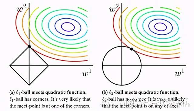 假设我们模型只有 w1,w2 两个参数,上图中左图中黑色的正方形是 L1 正则项的等值线,而彩色的圆圈是模型损失的等值线;右图中黑色圆圈是 L2 正则项的等值线,彩色圆圈是同样模型损失的等值线。因为我们引入正则项之后,我们要在模型损失和正则化损失之间折中,因此我们去的点是正则项损失的等值线和模型损失的等值线相交处。通过上图我们可以观察到,使用 L1 正则项时,两者相交点常在坐标轴上,也就是 w1,w2 中常会出现 0;而 L2 正则项与等值线常相交于象限内,也即为 w1,w2 非 0。因此 L1 正则项时更容易得到稀疏解的。