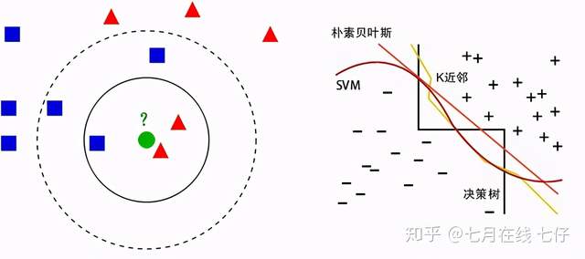 如果 K=5,绿色圆点的最近的 5 个邻居是 2 个红色三角形和 3 个蓝色的正方形,还是少数从属于多数,基于统计的方法,判定绿色的这个待分类点属于蓝色的正方形一类。