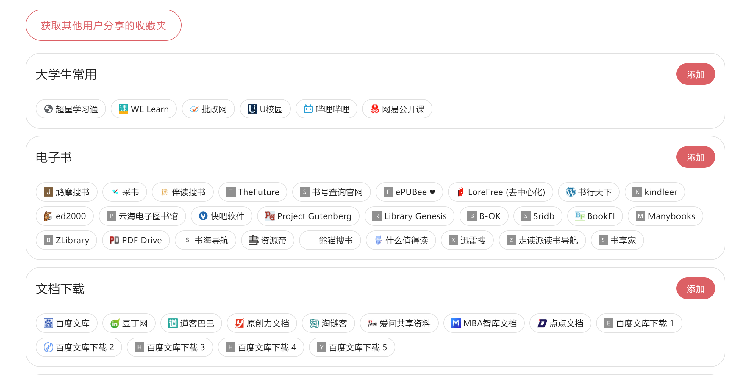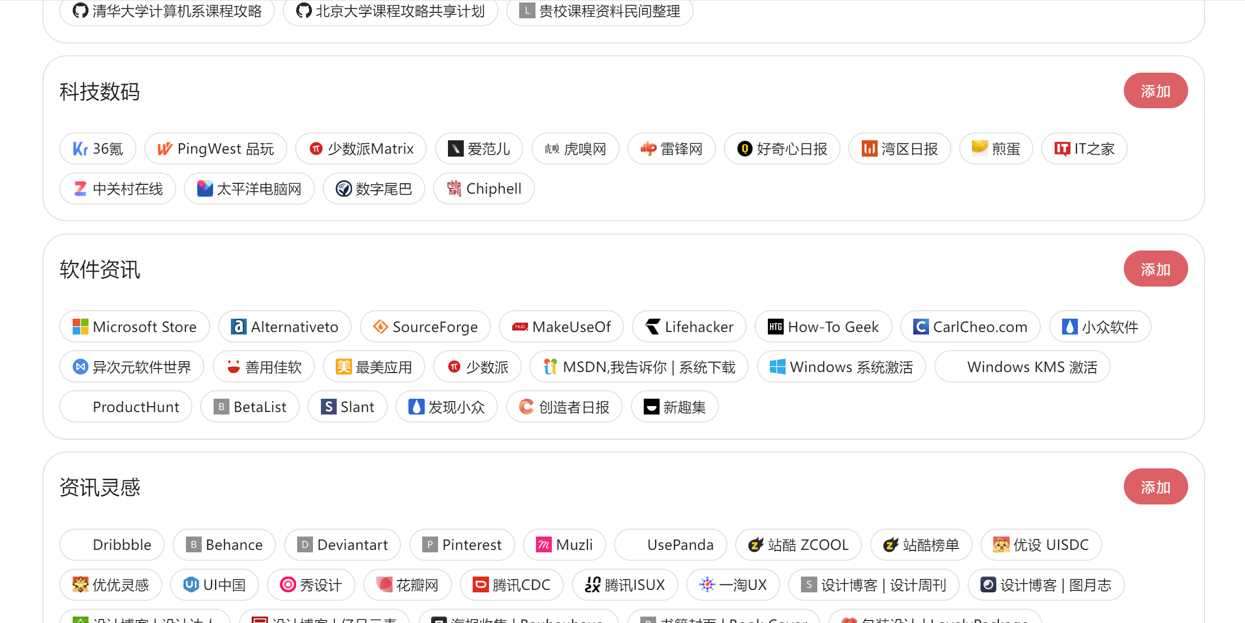 即使你的收藏夹空空如也,即使你还没有开始建立你的知识体系,这都没有关系。我们有热心的网友,他们将自己的收藏夹分享了出来,让大家不必苦苦寻找高质量网站。