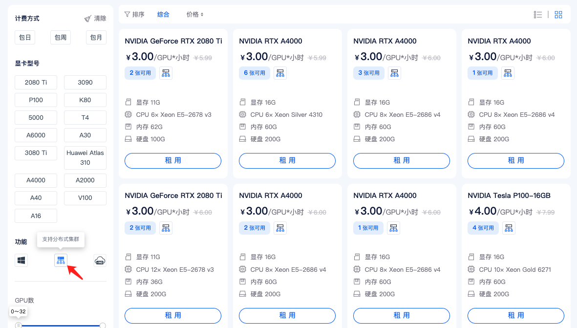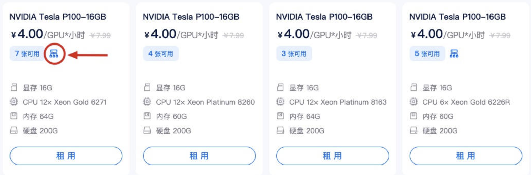 - 多机多卡分布式:需要先申请开通 分布式集群 功能,点击这里申请开通,在租用时,请选择带有如图所示图标的机器。没有这个图标的机器不支持加入分布式网络。