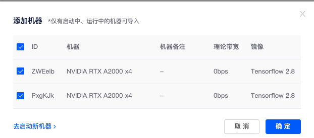 如两个计算节点,租用两台 A2000 4,共计 8 卡。选择相同的 TensorFlow 镜像,如 TensorFlow2.8 镜像。