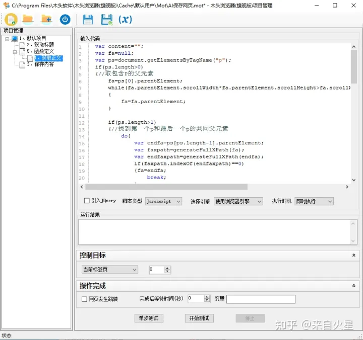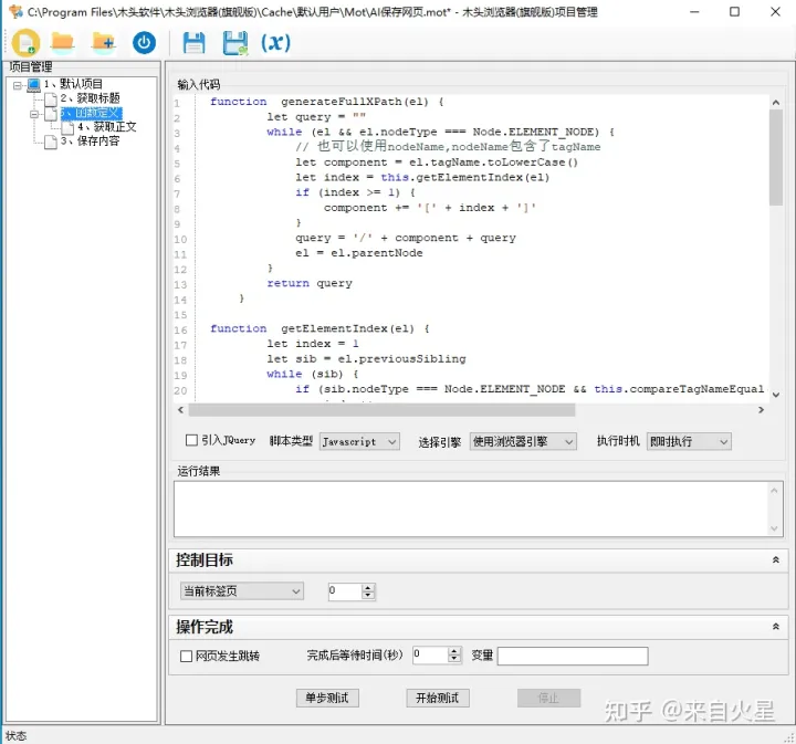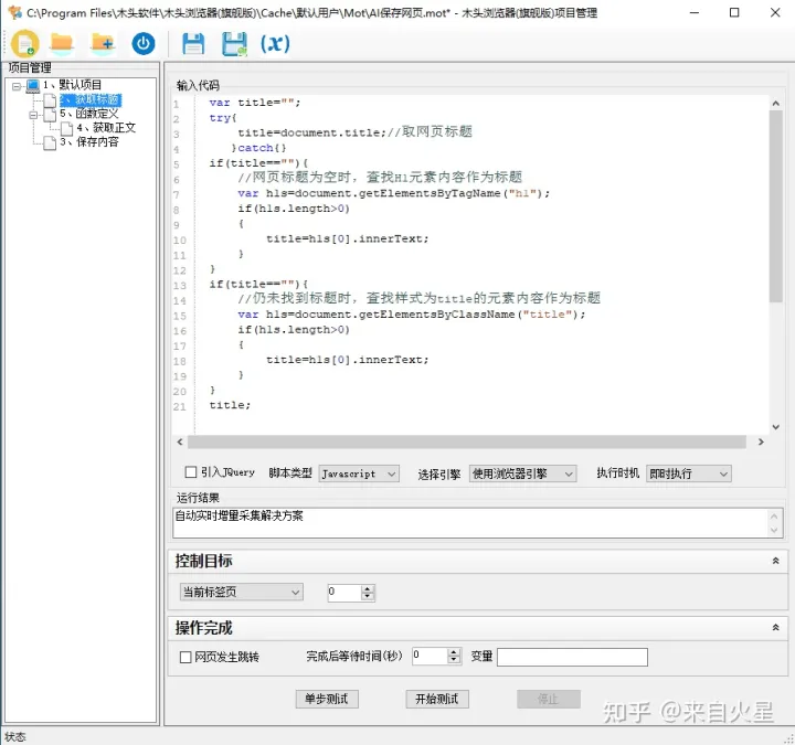 首先在项目管理器中,创建一个脚本代码步骤,通过执行一段 js 脚本代码找出文章标题。首先获取网页头部的 title 标签作为标题,其次是查找 H1 元素内容作为标题,如果还是找不到,则查找样式为 title 的元素内容作为标题。