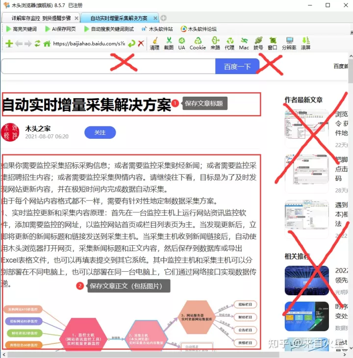 最后保存项目文件为“AI 保存网页”,通过点击书签按钮运行这个项目,就能智能识别网页标题和正文,保存网页有效内容和图片了。