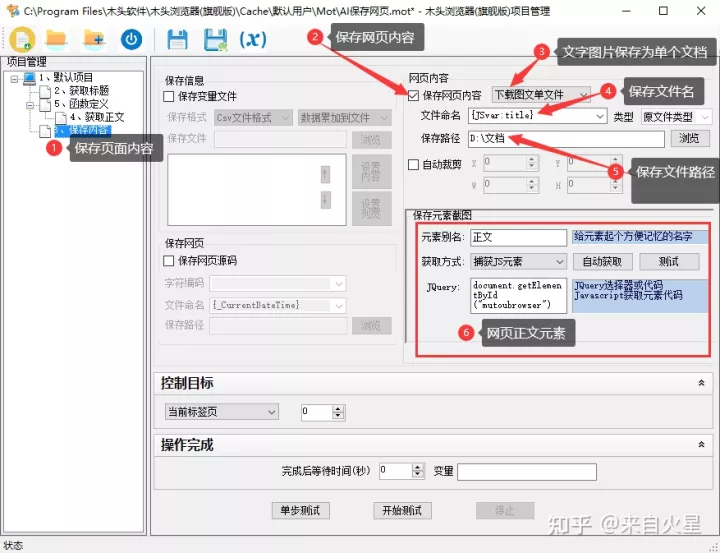 再创建一个保存内容步骤,勾选“保存网页内容”,选择“下载图文单个文件”。设置文件名为 js 变量 title,即标题做为文件名,并指定保存文件路径为“D:\文档”。在窗口下方设置正文的元素,通过 js 代码获得。