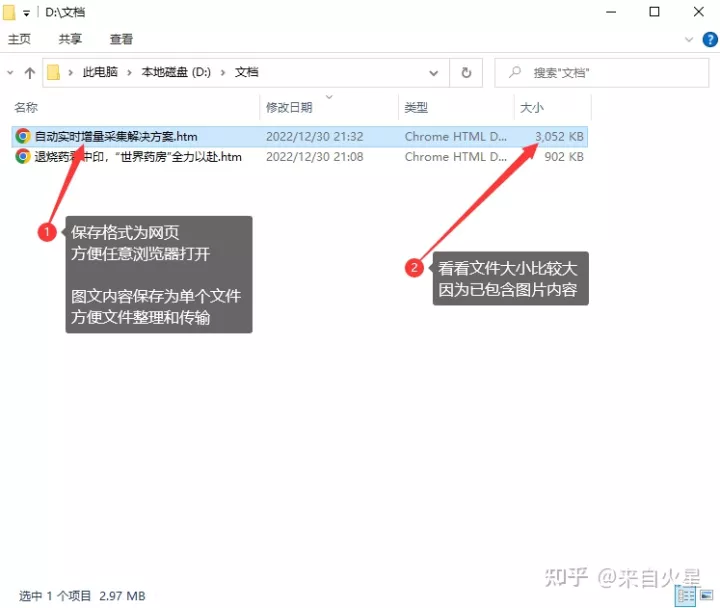 找到文档保存路径,可以看到以文章标题命名的网页文件。这个文档比较大,是因为同时保存和正文中的图片,也就是说把文字和图片都保存在单个文档中的。且为 htm 网页格式,可以使用任意浏览器打开。把图片保存在 htm 网页代码中,是什么原理呢?原来木头浏览器在保存网页时,自动把网页上的图片转换成 Base64 编码,这样就可以在单个文件中保存图片了。