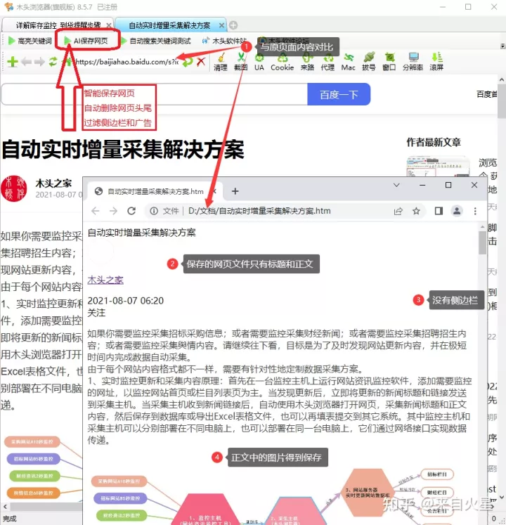 有没有一种方法,保存网页时,自动智能识别内容标题和正文,且仅保存标题和包括图片在内的正文内容,自动删除网页无效的头尾和侧边内容,更要过滤网页上的广告。这就是“AI 保存网页“,如下图所示,打开任意新闻、公告或文章页面,再点击”AI 保存网页“,就可以一键保存网页标题和正文。