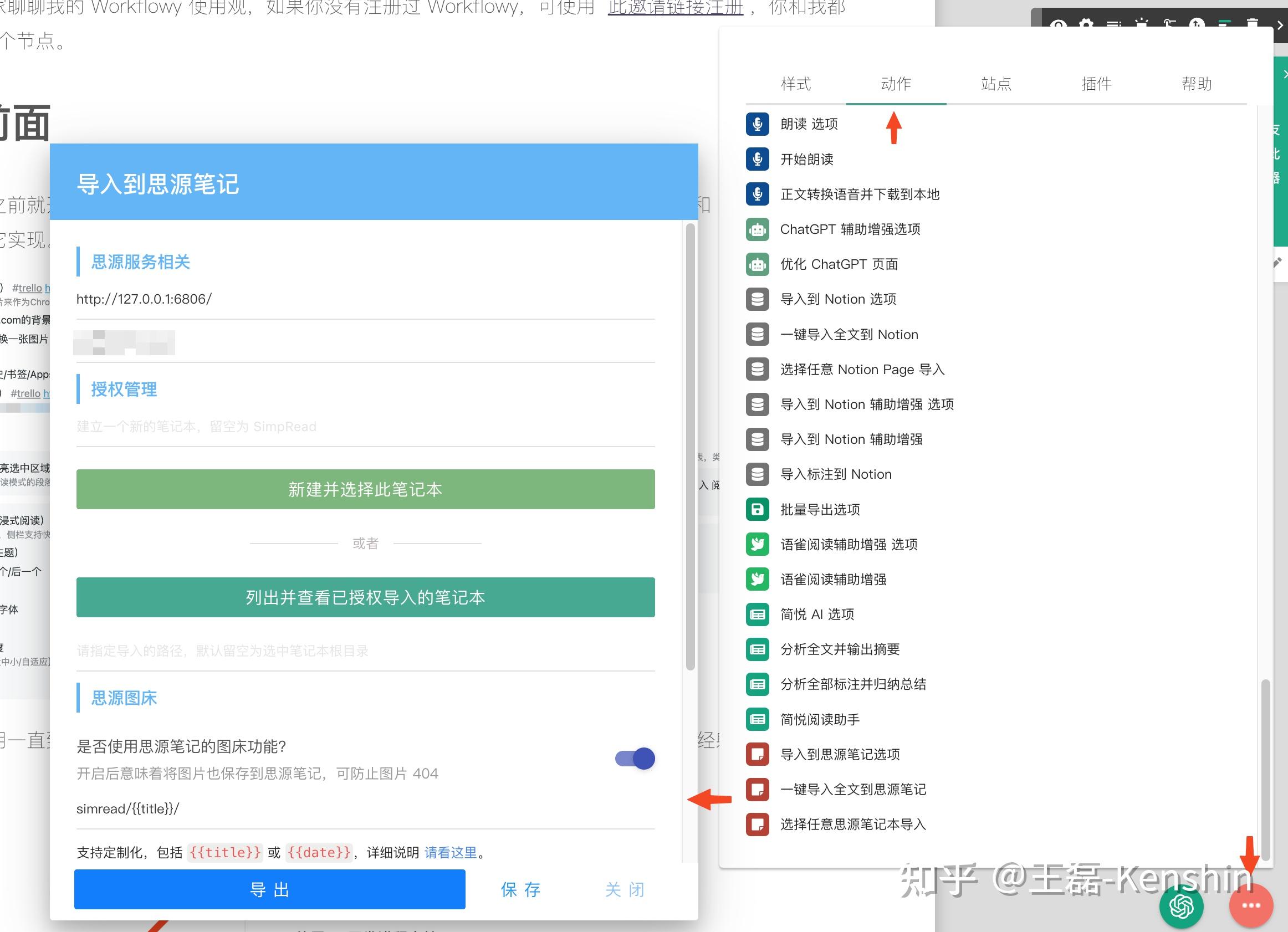 将阅读模式下的内容导入到思源笔记,包括将图片转换为思源图床。地址 https://simpread.ksria.cn/plugins/details/XxuF7bPTbo 视频操作快捷键 s y → 导入到思源笔记中 q s y → 弹出快捷导入面板(可在导入前选择不…