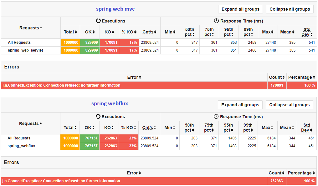 总体而言,与 Web Servlet 相比,WebFlux 能够在更少的资源下处理几乎相同的吞吐量。WebFlux 的响应时间也比 Web Servlet 更快。如果对 WebFlux 进行更大的队列配置,可能可以减少拒绝连接的数量。