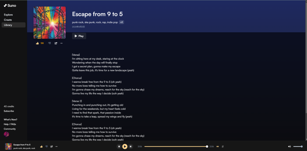 1、Suno 使用门槛很低,只要你能表达想法,都可以创作出来一首歌曲,对比一些需要填写很多复杂参数的产品来说,小白用户体验极佳。