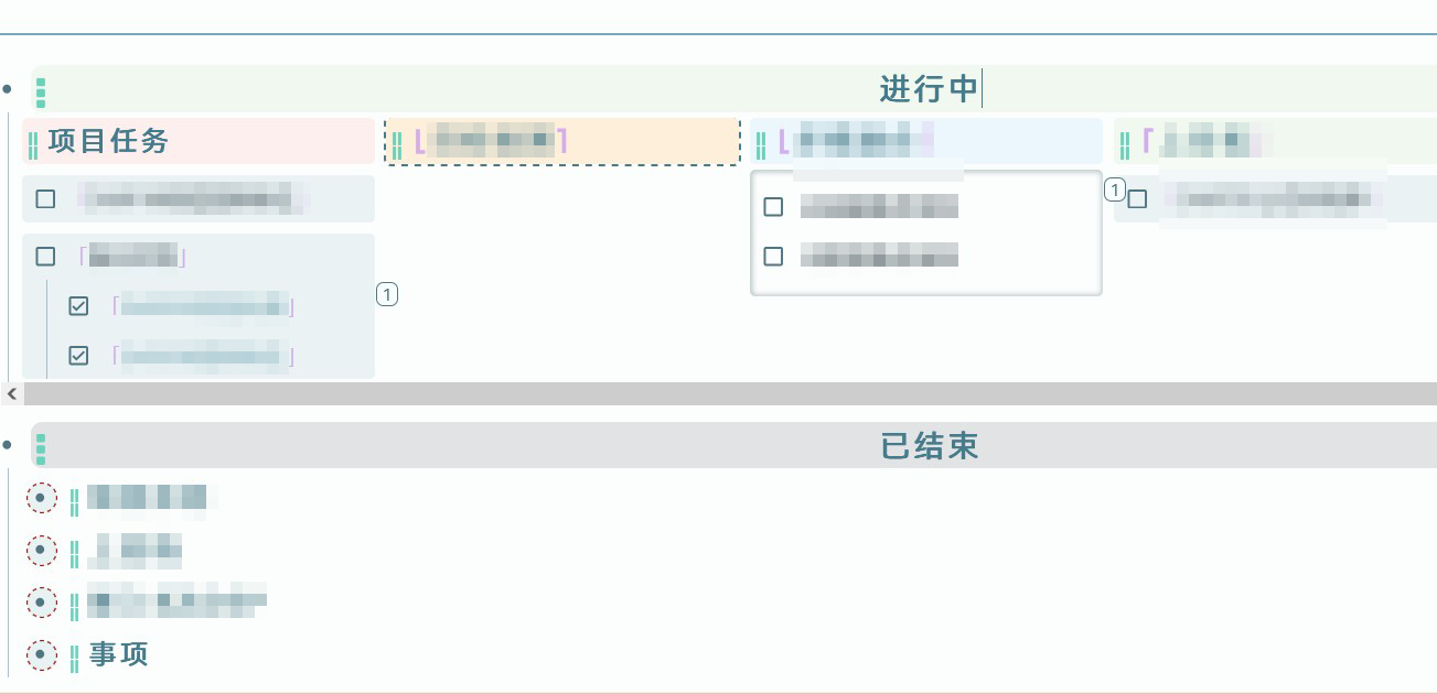 在 Project 区利用任务列表、数据库、列表看板视图等提供当前要做的项目任务的概览。在各项目的主题文档里可以放置项目中用得到的笔记的链接。个人使用的是自定义块样式插件的看板视图,用法比较简单。