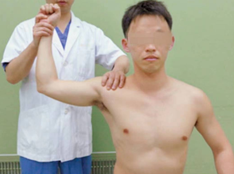 疼痛弧征(pain arc syndrome):患臂上举 60°~120° 范围内出现肩前方或肩峰下区疼痛时即为阳性。该检查的疼痛由损伤的肩峰下间隙内结构与「喙肩弓」之间摩擦引起。