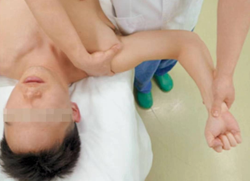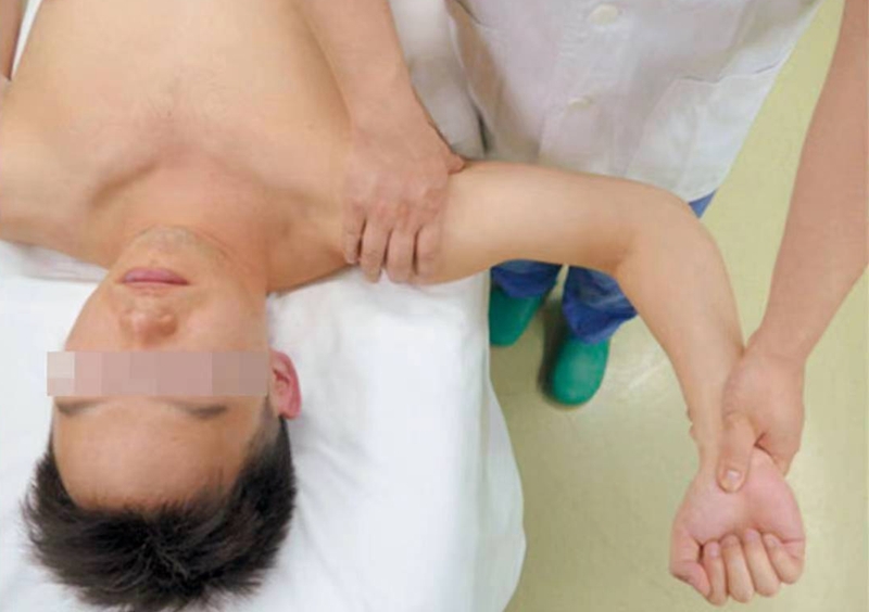 通常在仰卧位恐惧试验之后进行,当患者出现恐惧现象后,检查者用手压住肱骨近端施以向后的外力,若患者感觉的恐惧减轻,并且可以进一步外旋上肢,则认为复位试验阳性(图 11)。