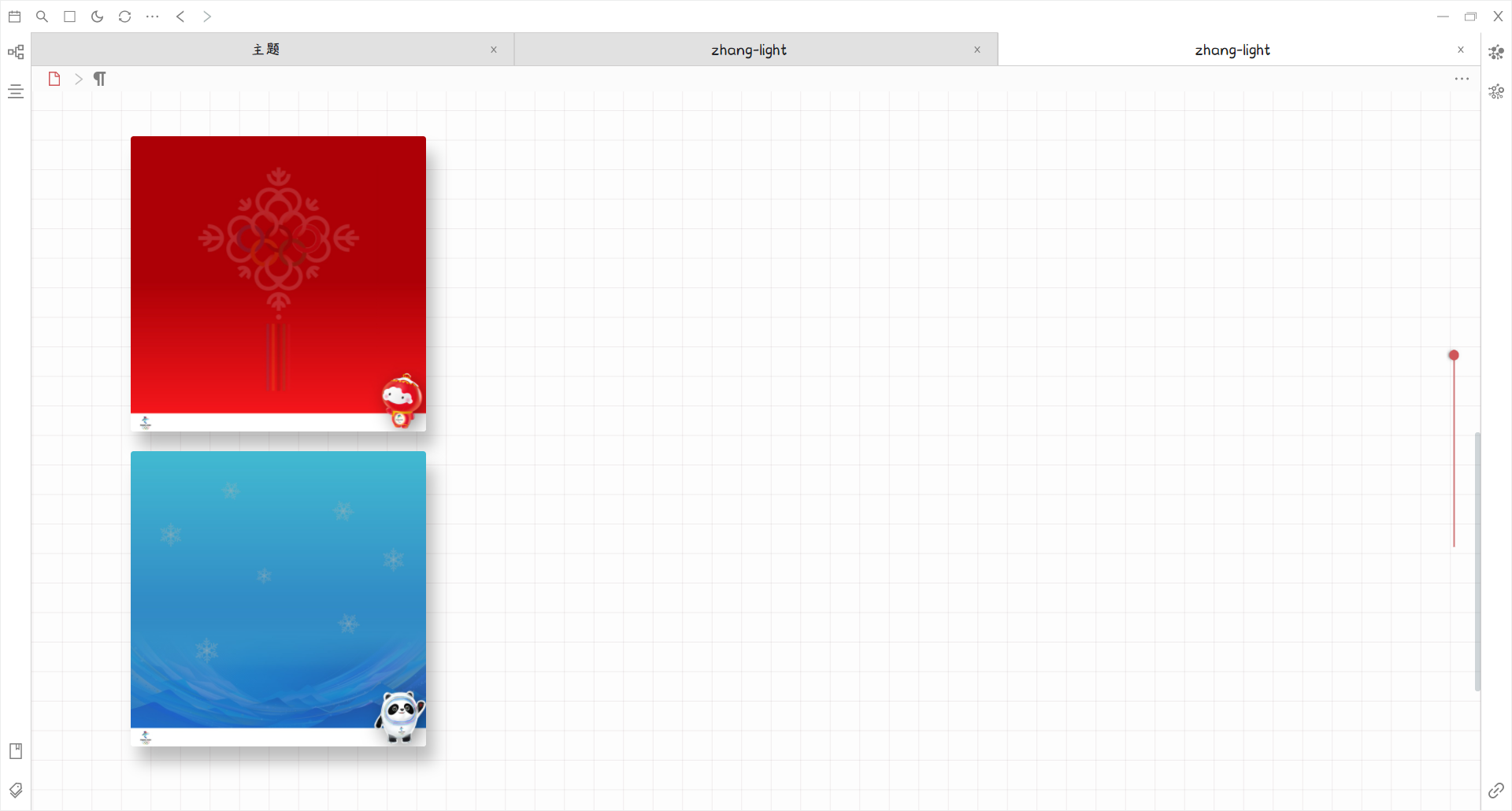 在得到群友们的热情鼓励后,我开始考虑加入更多酷炫的功能。比如自定义属性,便利贴样式,字体设置面板、网格背景等等。当时正值冬奥会举办,我还别出心裁,加上了限定版“冰墩墩”、“雪容融”便利贴蹭热度。就这样,在大家的意见和建议中,我踏上了自己制作主题的道路,不断对主题进行更新完善。