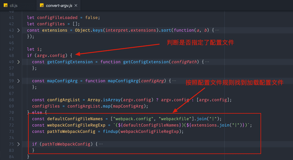 在 convert-argv.js 工作过程中,首先为传递过来的命令行参数设置了默认值,然后判断了命令行参数中是否指定了一个具体的配置文件路径,如果指定了就加载指定配置文件,反之则需要根据默认配置文件加载规则找到配置文件,具体代码如下:
