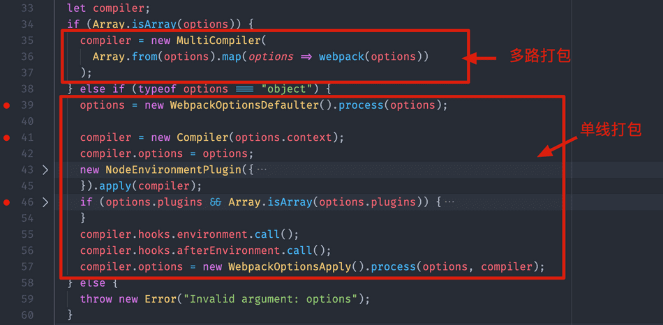 如果 options 传入的是普通对象,那么 webpack 会按照最常规的方式创建一个 Compiler 对象,进行单线打包;如果传入的是一个数组,那么 webpack 内部会创建一个 MultiCompiler 开启多路打包,数组中的每一个成员(项)都是一个独立的配置选项;